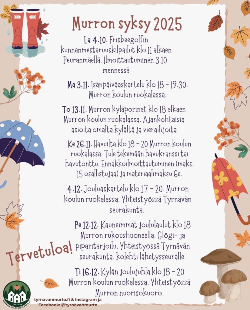 Murron kylätoimikunta järjestää erityisesti oman kylän väelle useita tapahtumia vuoden aikana. Hallitus julkaisee vähintään kaksi kertaa vuodessa Murron tiedotteen, johon on koottuna kunkin kauden tapahtumat. Tiedote jaetaan Murron kyläläisten postilaatikkoihin ja tapahtumista saa ajantasaiset muistutukset Murron tiedotuskanavalla, jolle voit liittyä täältä.